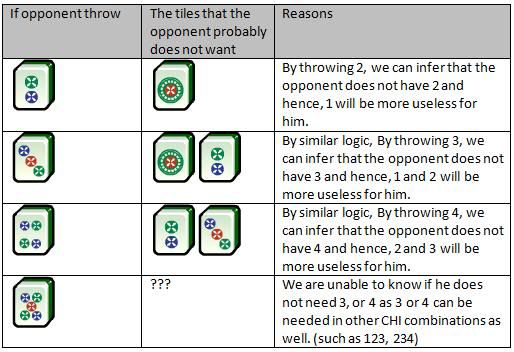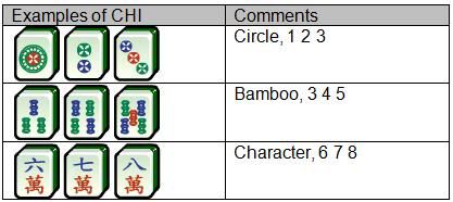 Another way of forming the group of three is to have a CHI. A CHI is to have 3 suited tiles of the same suit in running order. From example,