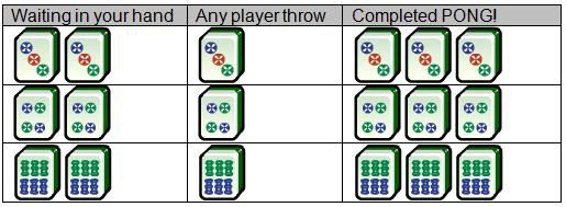 The concept of PONG is easy to understand as well. PONG is having 3 of the same tiles! You can take the PONG from any player who discards! By taking the extra tile from any player, you will have to reveal the completed PONG. (So that others will know that you indeed have a PONG!) Remember to shout out “PONG” happily to disturb the flow of the game as now it becomes your turn. Discard one tile as usual after your turn.