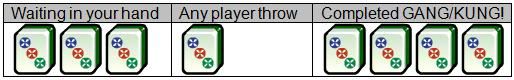 GANG/KUNG is an extended and slightly more ‘powerful’ version of the PONG, where the player has 4 of the same tiles! In this illustration, GANG/KUNG is considered a group of “three” tiles needed for forming the groups of three and a pair for winning. It is slightly more ‘powerful’ as people will have to pay you a small token when u GANG/KUNG. (Obviously, It is a more rare event than PONG!)