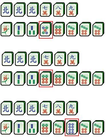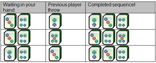 How to get the 3 tiles in sequence? First, you could draw all 3 tiles yourself! These tiles do not need to be revealed =) Second, you can get ‘help’ from the player before you turn. If you have 2 out of the 3 tiles in sequence and the player before you throws out the tile that will complete your sequence, you can take his discarded tile. Reveal your 2 tiles and take his discarded tile and confidently shout out “CHI”! =) Some examples are shown below